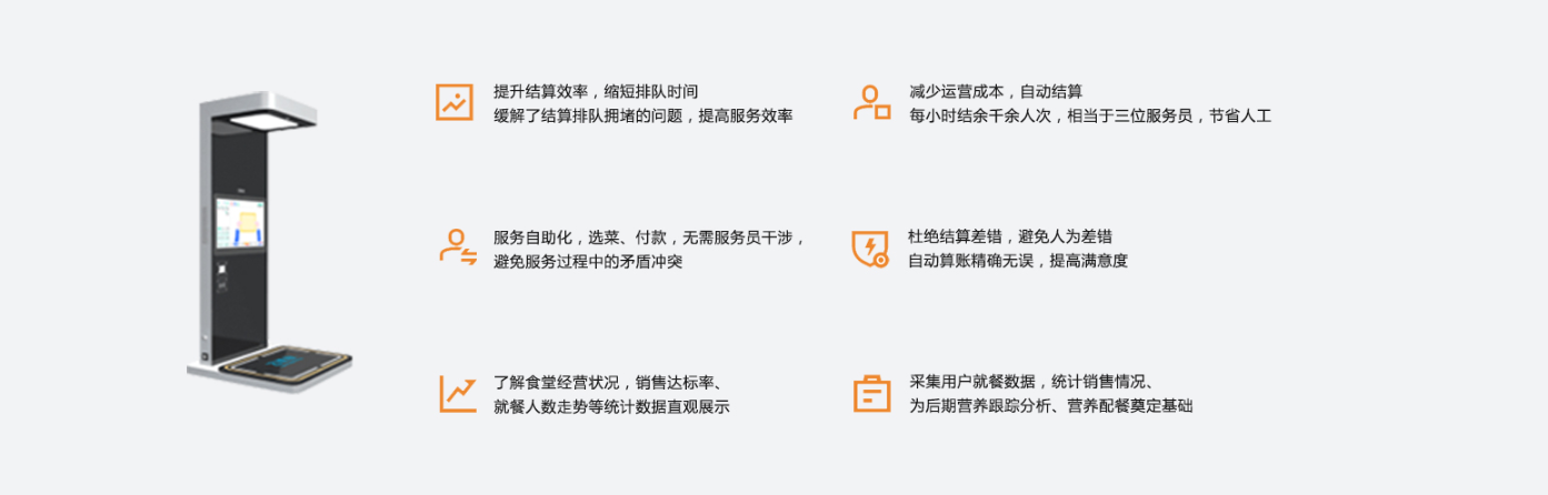 用户自选用餐,AI图像识别结算仅需0.3S,数据上云,支持用餐营养分析和运营管理分析